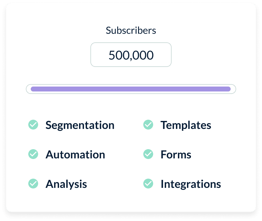 See what's includedUnlike AWeber, you'll find our pricing plans for mailing lists up to 500,000 subscribers. We provide you with transparent pricing that scales in affordable increments as your subscriber count grows.