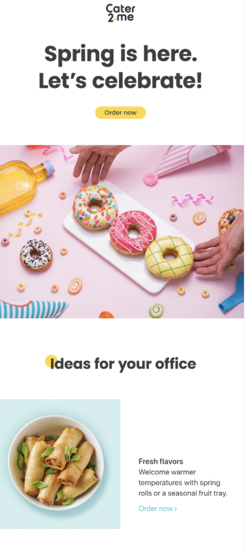 Here’s a stellar March newsletter idea from Cater2.me, a customised catering solution for companies and teams, celebrating the beginning of spring with dish ideas for the office.