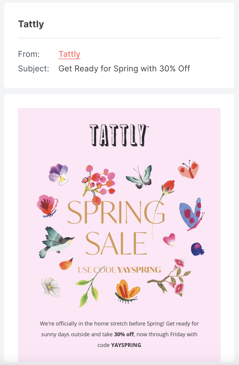 An excellent March newsletter example is the email campaign by Tattly, which promotes temporary tattoos as wearable art. And what better time to revamp your aesthetic by getting your tattoos for the new season? They kicked off the season with a 30% discount to incentivise impulse purchases. Feast your eyes!
