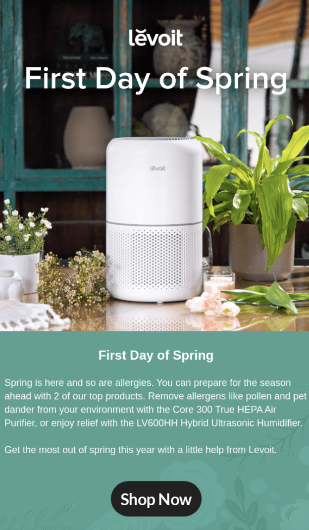 So, if your products are seasonal, this is an excellent opportunity to introduce them to your audience as the solution to their seasonal needs and their best allies to enjoy care-free days. Like Levoit did with their email campaign for humidifiers on the first day of spring.