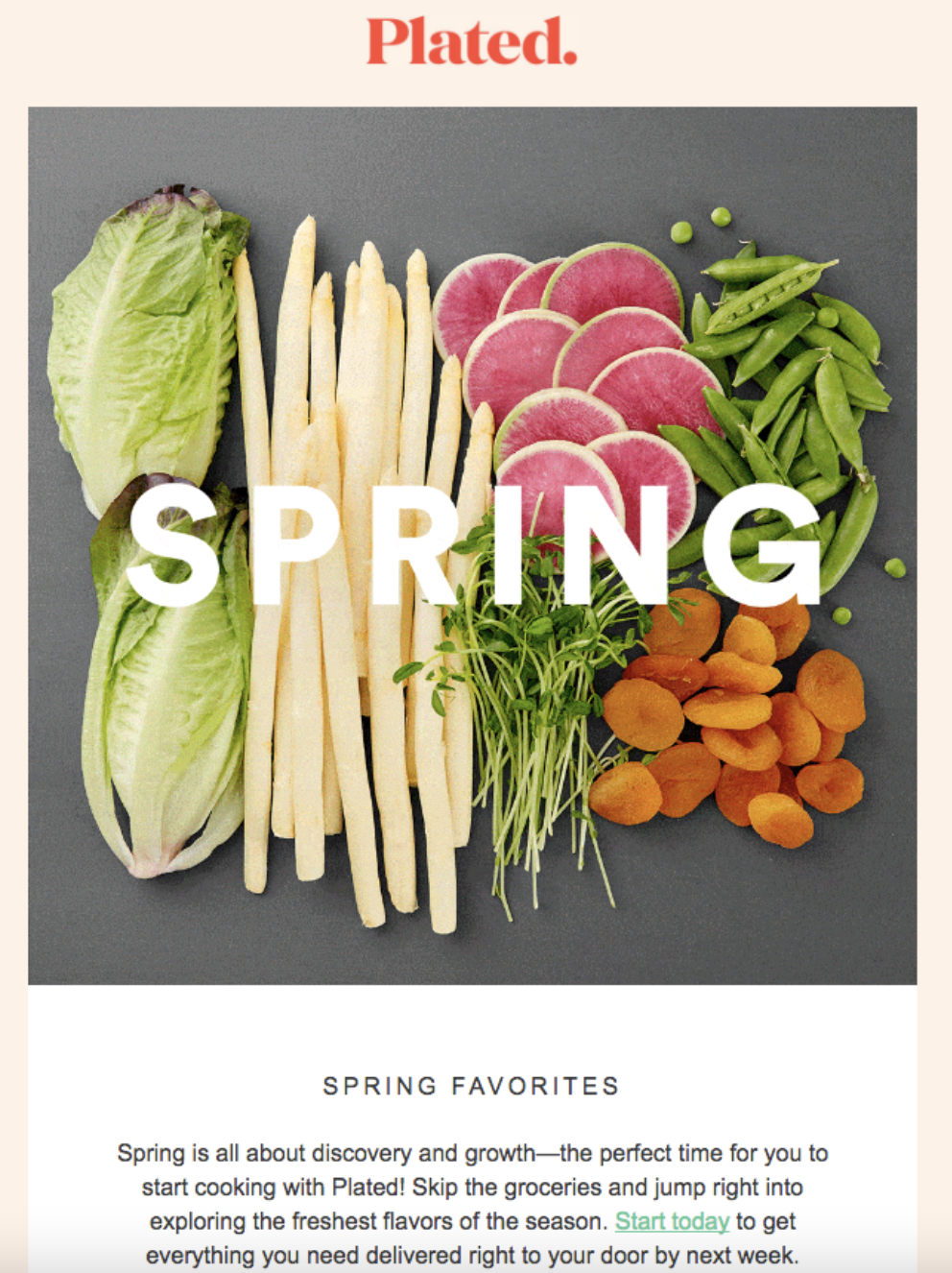 Build your newsletters around knowledge in the form of tips, hacks, case studies, checklists, playbooks, spreadsheets or even downloadable ebooks. You can use your existing content and repurpose it into beautiful email campaigns. For example, Plated created a newsletter around different tastes of spring and product ideas to freshen up everyday meals. Yum.