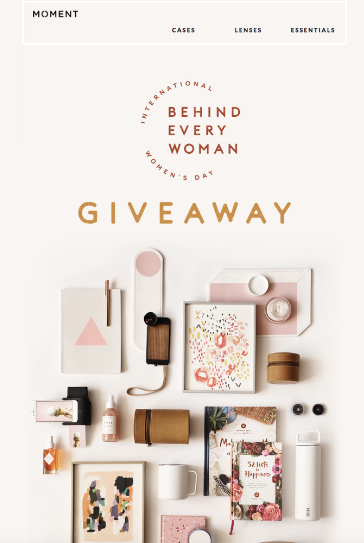 Alternatively, you can organise a giveaway to celebrate women as Moment did for March. Specifically, they partnered with other brands on Women’s day to give away $5,000 in prizes related to products, art, and experiences.