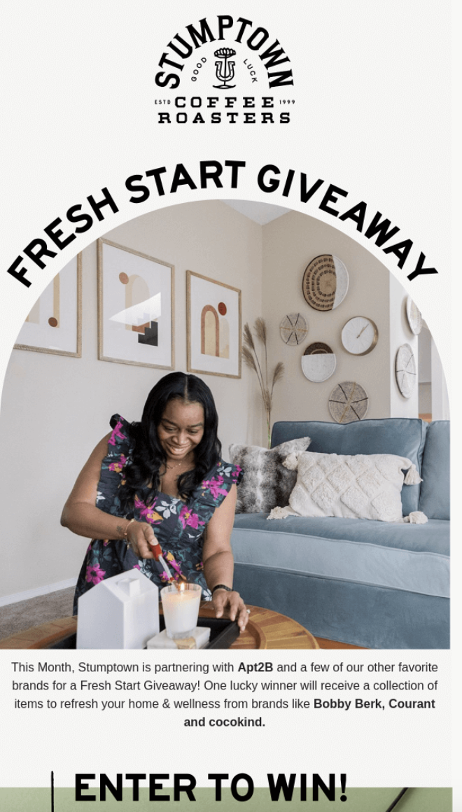 Stumptown Coffee Roasters did just that, partnering with Apt2B for a special giveaway where the winner received different prizes to refresh their home and wellness.