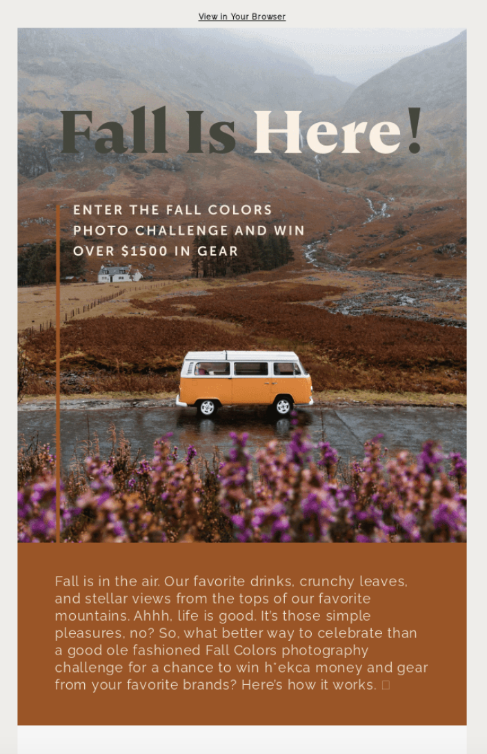 Moment created a similar email campaign for fall, based on a photo challenge with the prize of $1,500 in gear. Users had to use social media, upload their favourite photo with the hashtag #MomentChallenge and follow certain accounts to enter the fun!