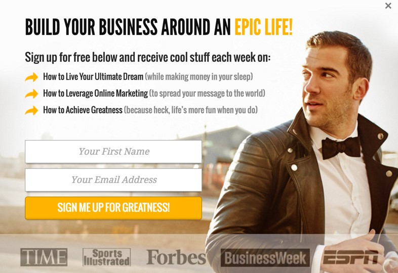 Principle 3 (social proof) – The bottom of the opt-in box has the logos of highly respected, long standing publications including Forbes and Time Magazine. This is used to instil a great feeling of trust in the visitor’s mind. Which reduces any uncertainty or perceived risk of signing up.