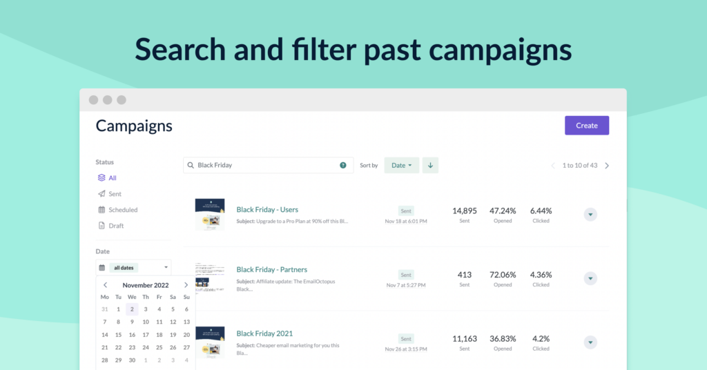 In the case of campaigns, you can search by the subject line or campaign name to find the exact campaign you want to duplicate. Or, if you’re less sure, use the filtering and ordering tools, where you can filter by date to discover your past campaigns.