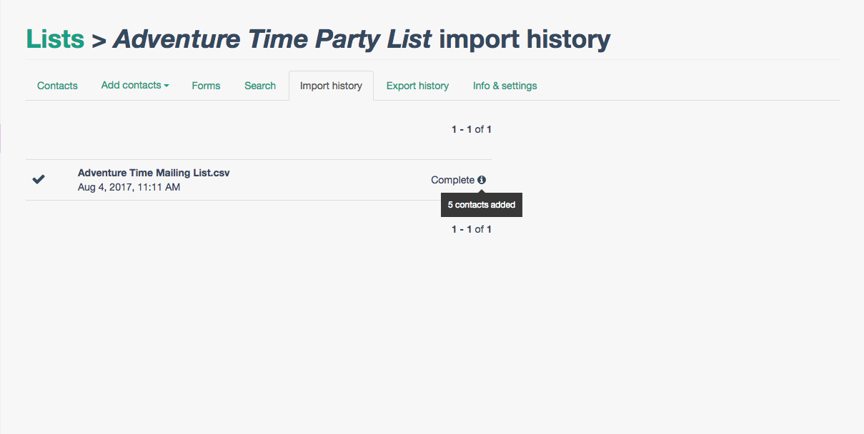 The final element to have been changed is the ability to view your import history. When an import is complete, this will now show up on the import history section of the list. Hovering your cursor over the ‘i’ next to the status tag will give you information on the division of successfully imported contacts and contacts that have had an issues with their import.