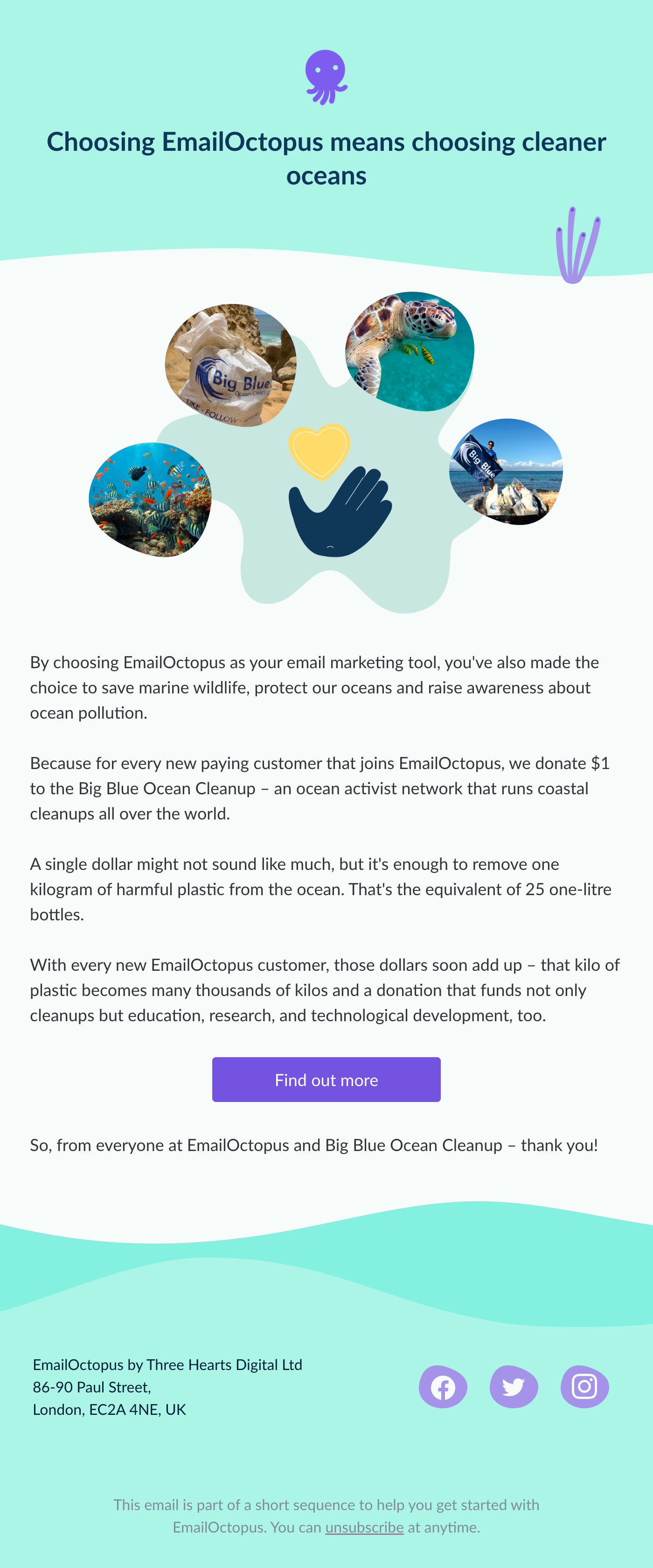 For instance, at EmailOctopus we donate to an ocean cleanup non-profit for each customers who signs up. With our sea themed branding, and the environment top of many peoples minds it supports a massively important cause while highlighting our ethical brand values. As a result, it helps earn trust and create awareness around both our brand and a very important problem.