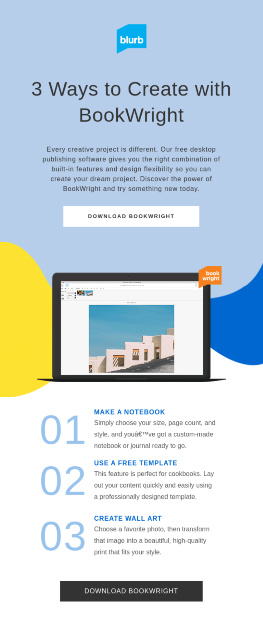 That’s what Blurb did with a B2B newsletter to educate their readers on using their publishing software BookWright. With a comprehensive breakdown of actions, they guide them into their first steps, and with a strong CTA, they invite them to download the software.