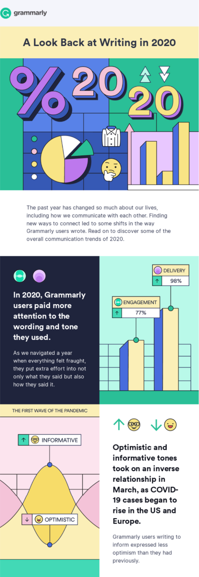 A stellar example is Grammarly. With a B2B newsletter, they invite readers to look back at writing in 2020, a year that brought unprecedented changes in our lives. By sharing communication trends, they offer valuable information on what users prioritise now in their writing, which also helps them create awareness around the features their software offers.