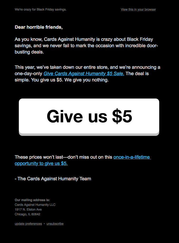 Cards Against Humanity are famous for their anti-Black Friday stunts. They’ve run a number of promotions including sales where you pay $5 for nothing, selling ‘bullshit’ (which 30,000 people bought) and in 2016 they ran a stunt where subscribers could pay $5 to help dig a hole – it was affectionally named “money thrown in the hole”.