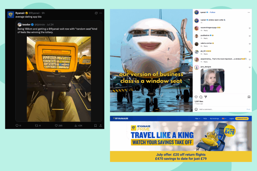 Ryanair’s tone is known for being bold and cheeky, especially on social media. They’re not afraid to make fun of themselves, competitors, or even their customers. This lighthearted approach makes their brand memorable and relatable—especially for a cost-conscious, no-frills audience.