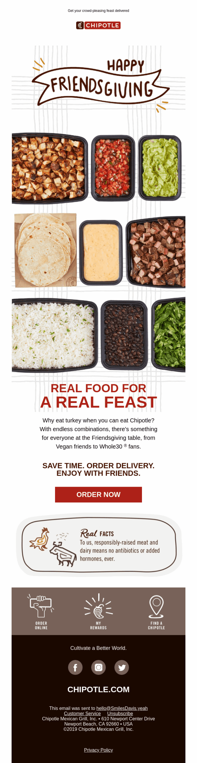 Thanksgiving is a big event for most families, and many love to get food delivery instead of cooking. This marketing email by Chipotle seizes on this exact opportunity and promotes its food.