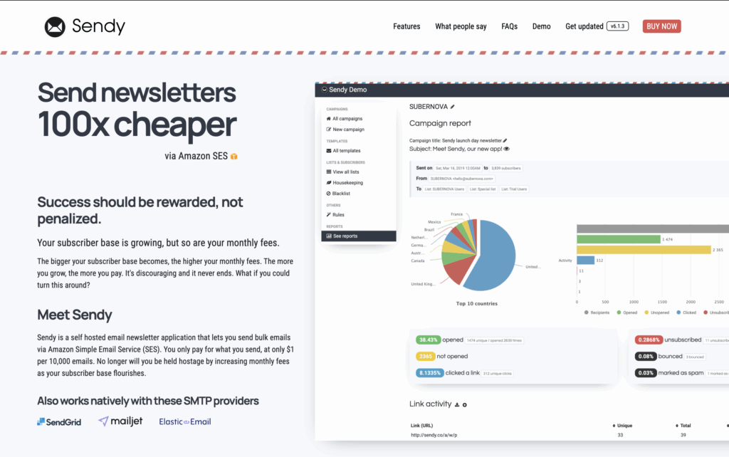 Sendy is a self-hosted email marketing tool that you can host and run on your own server. It uses Amazon SES to send emails affordably. With Sendy, you can manage email lists, set up automatic replies, and view reports on your campaigns.