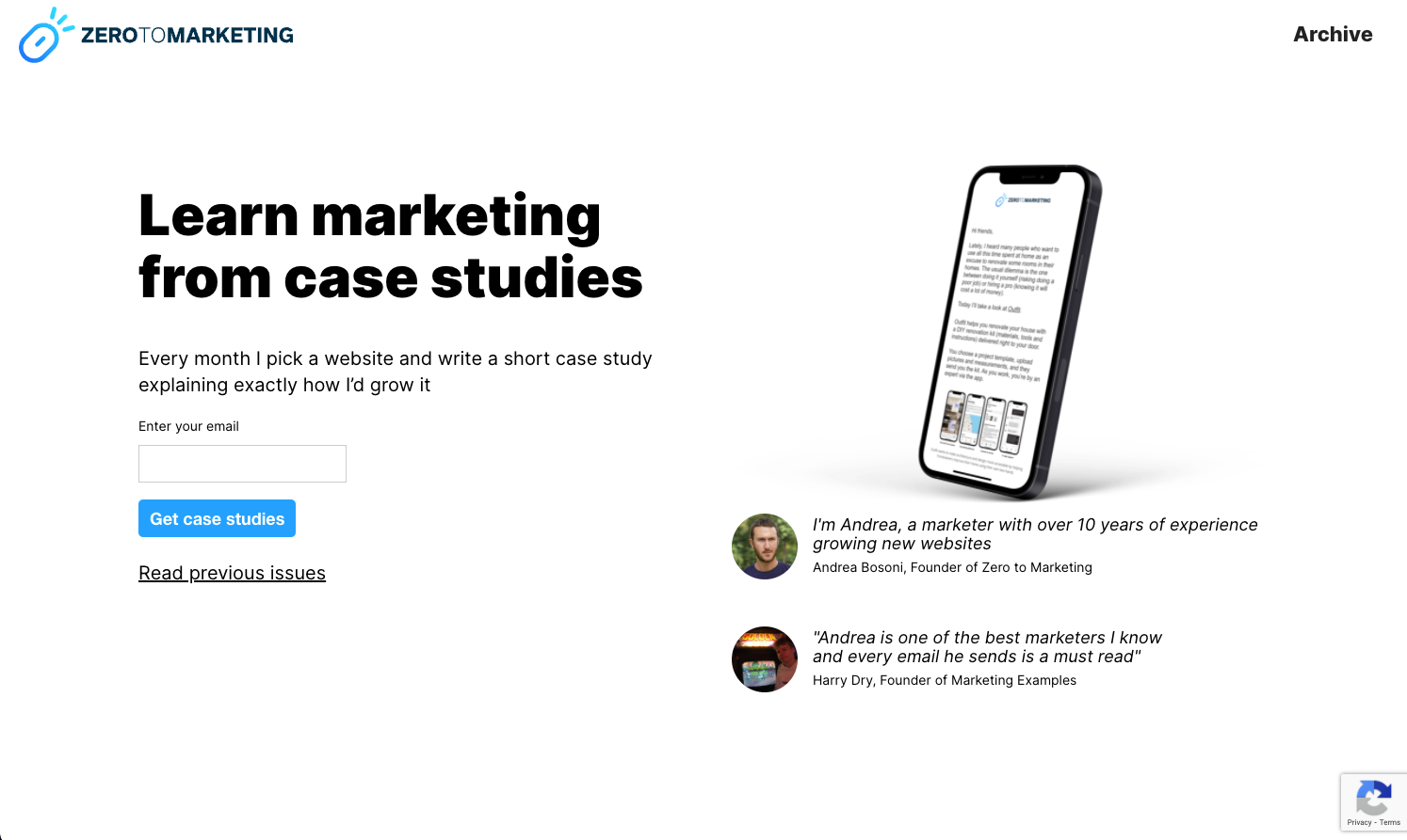 Zero to Marketing is a newsletter that chose EmailOctopuses’ simple landing page form creator to design a minimalist email signup page and rake in more than 1,400 subscribers.
