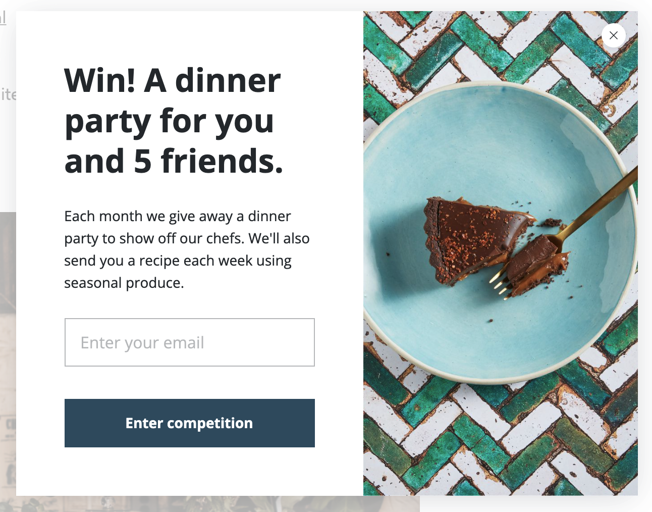 So following this Nomad Cooks pop up example, their short description reveals that they conduct this giveaway every month, and provide chef’s favourite recipes, dinner party tips and tricks, and discounts and offers (seen in the pop-up’s background).