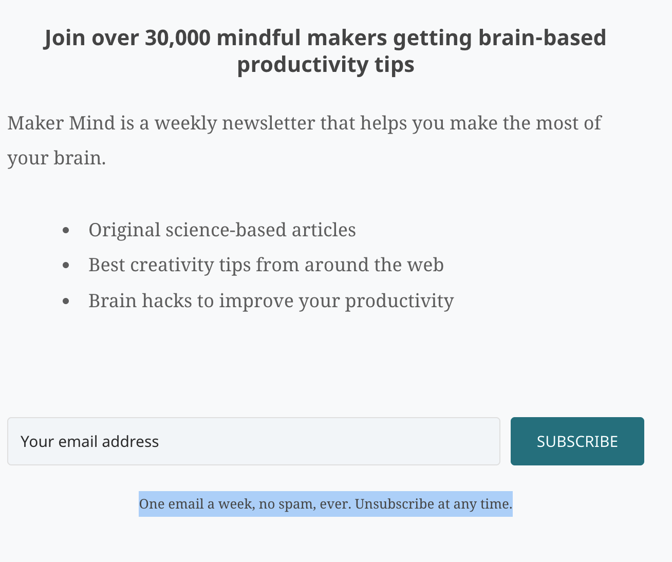 For instance, Anne-Laure from Ness Labs has this message under the input field: One email a week, no spam, ever. Unsubscribe at any time. It’s short and simple, and conveys the right point across.