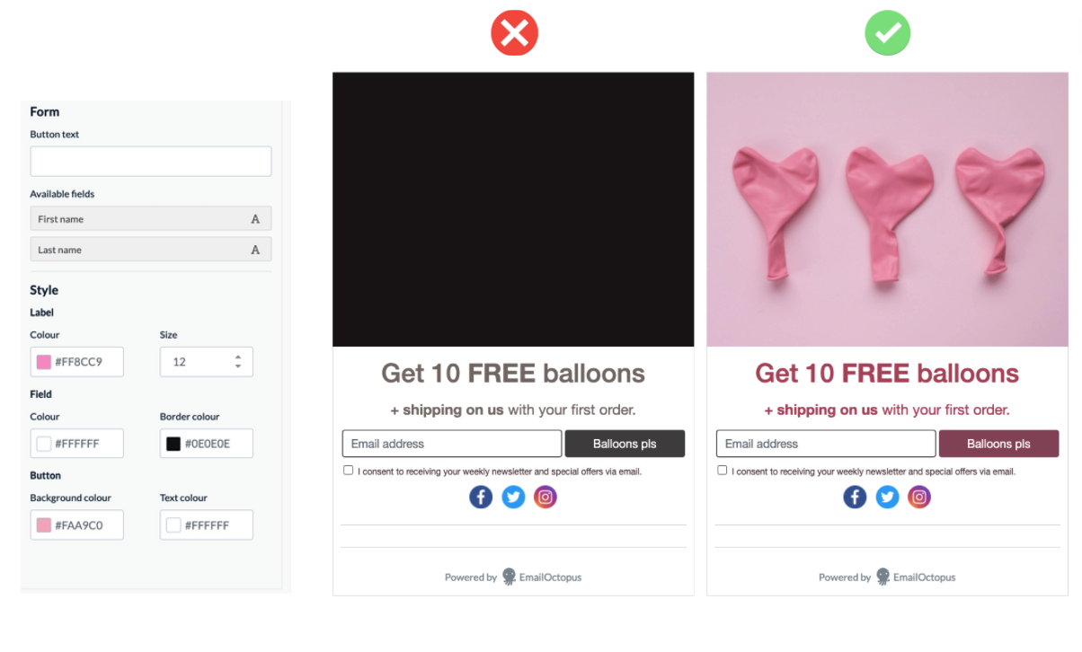 Using the EmailOctopus form editor, you can add a personal touch with an HD photo of the (would-be) balloons, use pink colour shades, and add bolded text, instead of keeping it all black and grey: