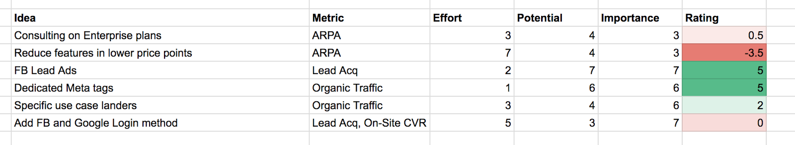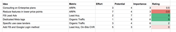 The remaining ideas we don’t work on go into our ideas spreadsheet, along with a more scientific (but less fun) way of choosing future experiments to work on. We prioritise these based on effort, potential and importance of the metric they’re moving. This list of experiments then gets chipped away at, with less urgency, by our marketing team during regular times.