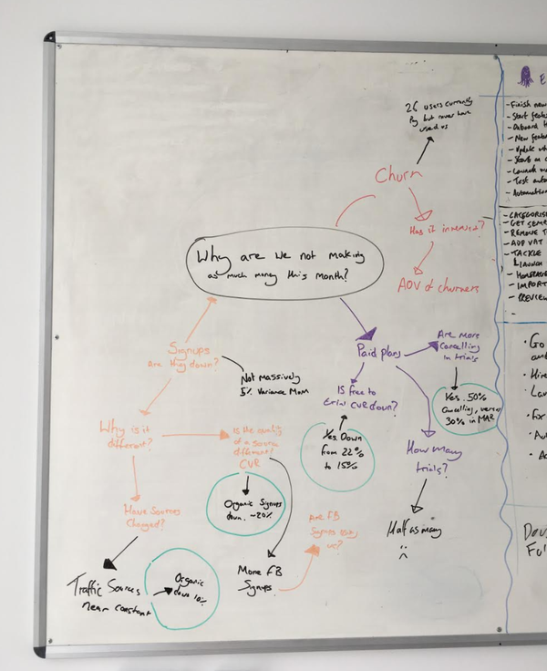 From the core question we whiteboard out all the factors which may contribute to a slower growth in revenue. These include factors such as churn, whether overall acquisition of leads and trials is down, or whether an issue lies within the paid plans. From each of these factors we draw off questions for us to answer through data analysis, examples of some questions are below: