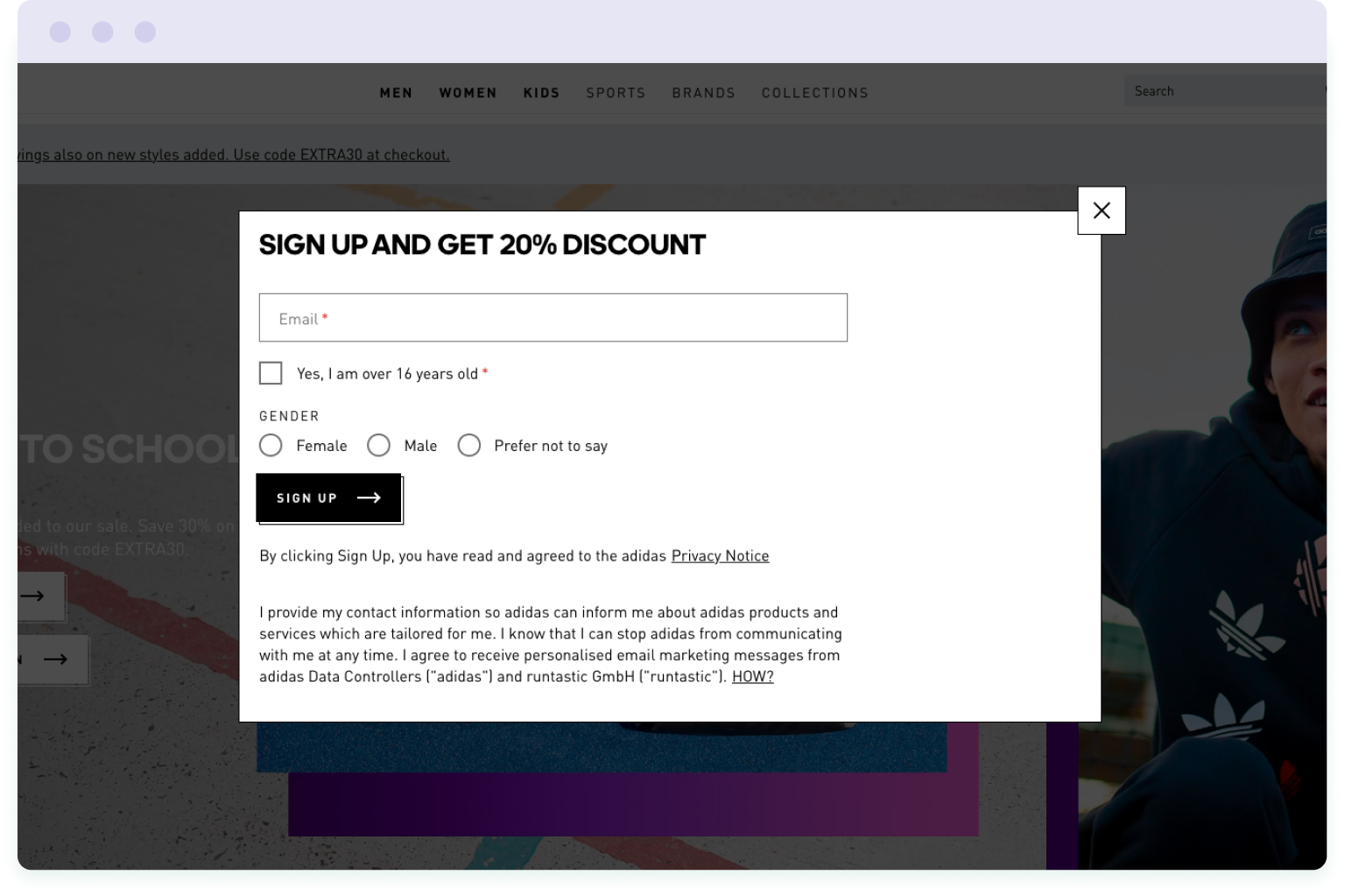 On the left (below) we have the pop-up form displayed on the Adidas website. There are no images in the form – just the copy, form fields and CTA button, plus a lot of white space.