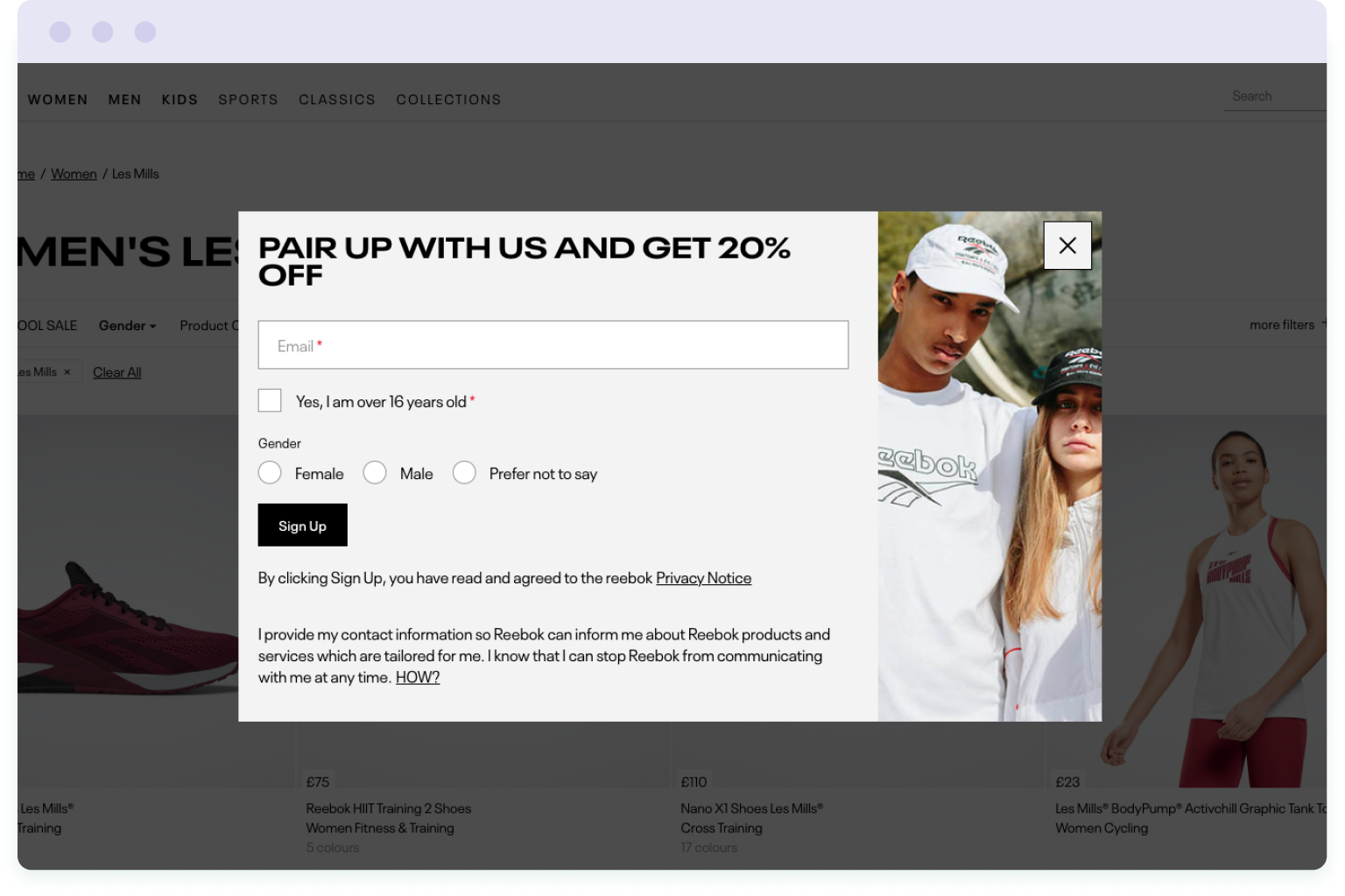 Compare that to the pop-up form on the right, which is displayed on Reebok’s website. This form includes an image of two models wearing Reebok clothing. The form fields and layout are very similar to the Adidas form, but which one grabs your attention first?