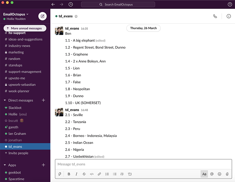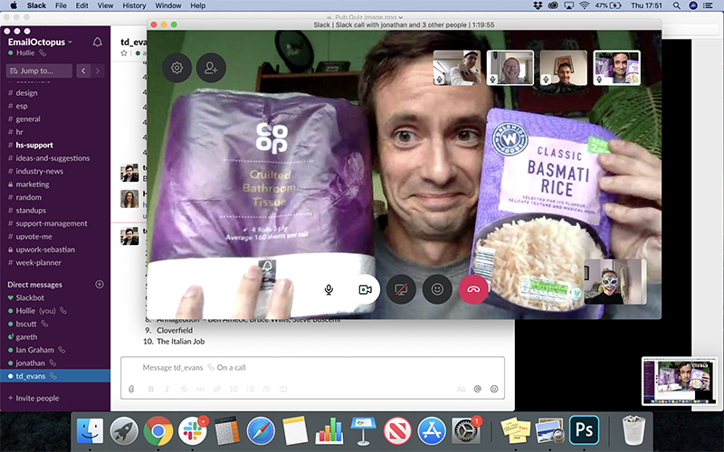 If you’re planning an online pub quiz for your work mates, Slack has everything you need to host it. That’s what we used for ours. You can get everyone* on a video call while players use direct messages to send their answers to the quizmaster.