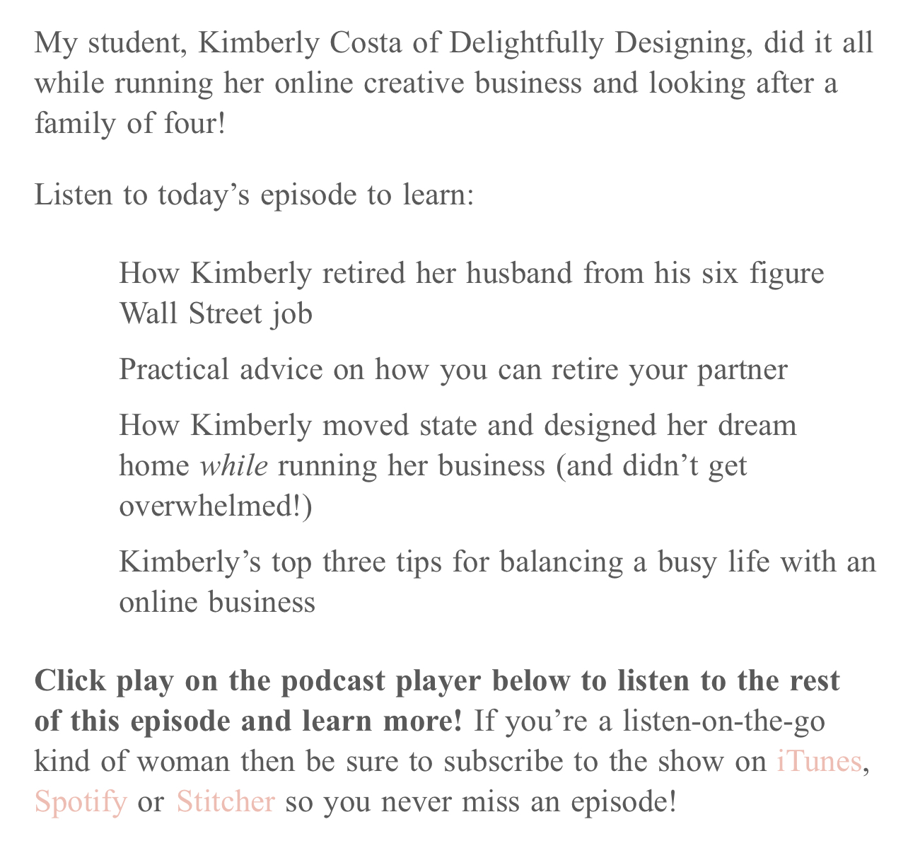 Neesha shows that you can also tell stories using audio. She used the email to introduce the story then redirected her readers to her podcast where they can listen to the full success story.