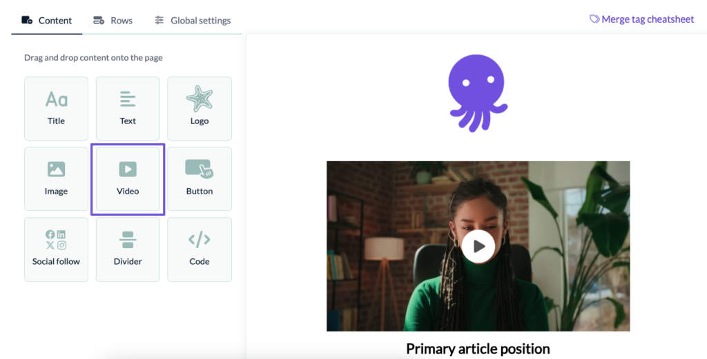 If you are using EmailOctopus as your email marketing tool, then simply go to the email builder page and on the left side you’ll see the video embed tool icon. Just drag that into your email design.