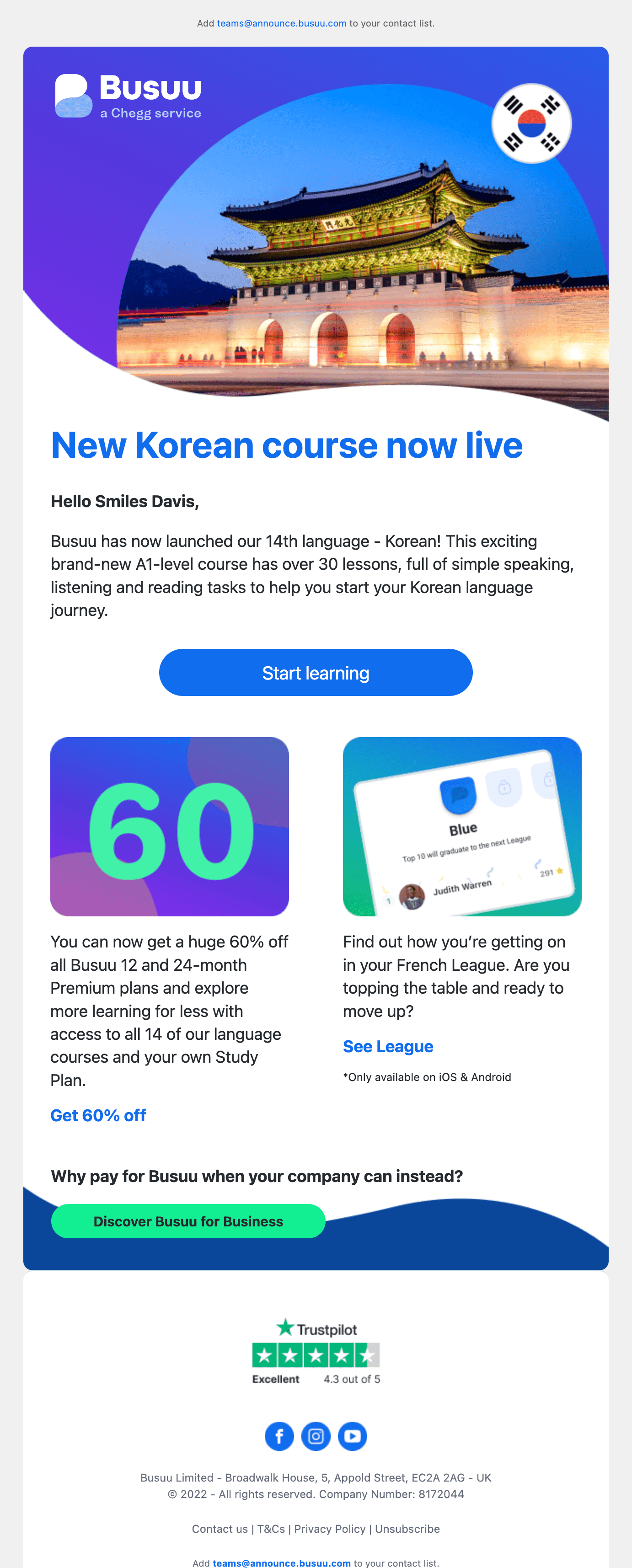 Finally, this is an email from Busuu about their Korean course launch is another great example.