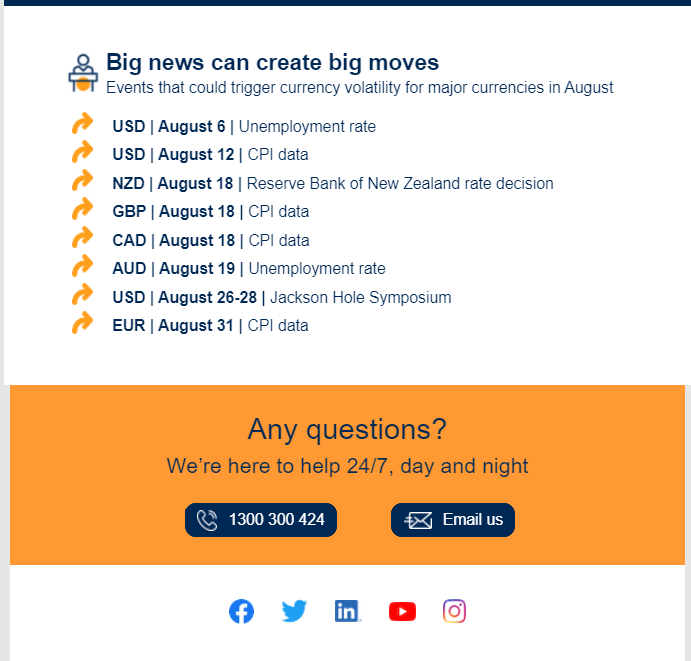 As the reader scrolls through the newsletter, they will find summaries of articles on OFX’s blog, such as outlooks for widely-traded currencies and an explanation of the factors that influence rate movements. OFX has also thoughtfully included estimated reading times for each article so readers know how long it will take them to consume the content.