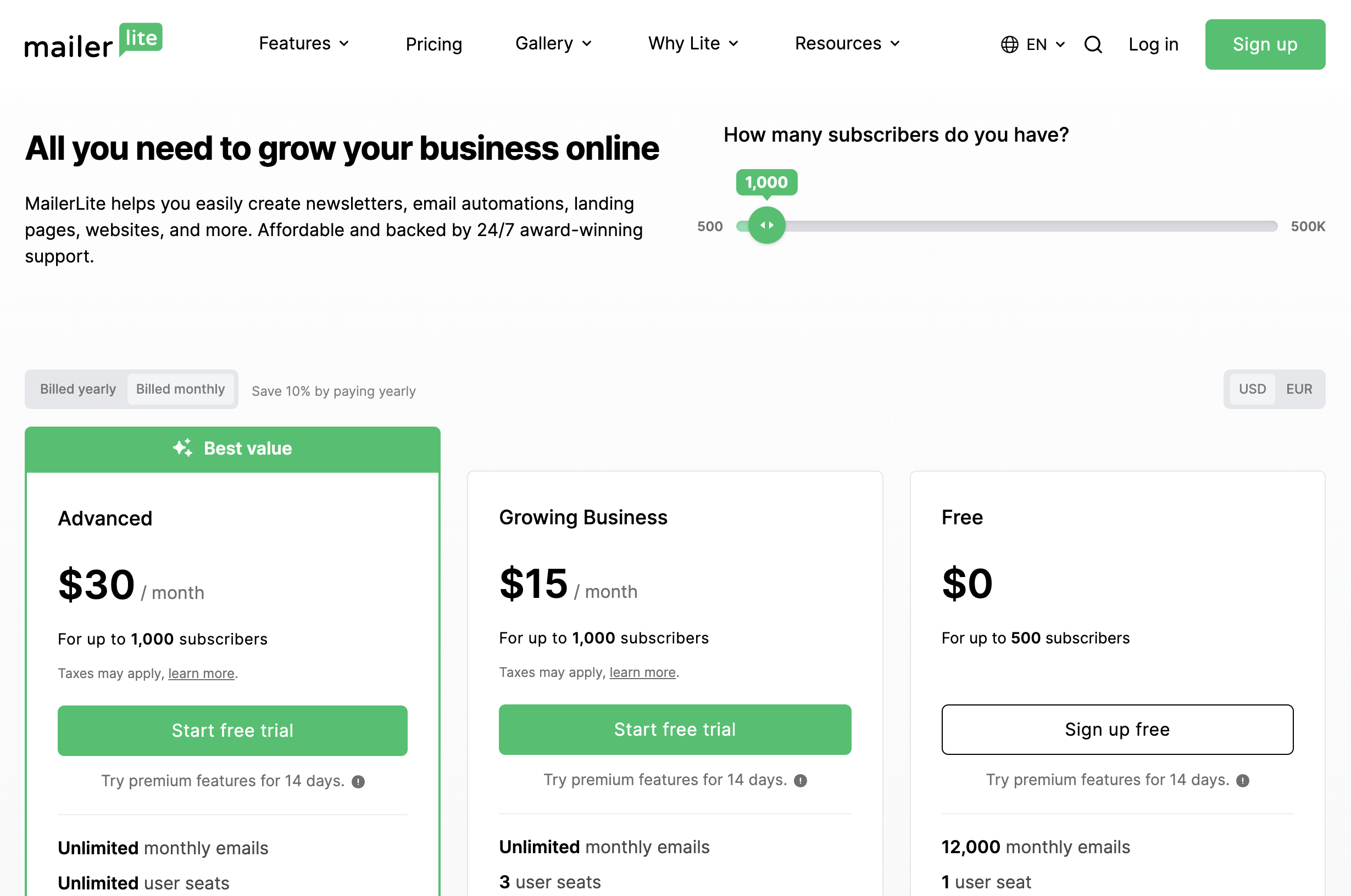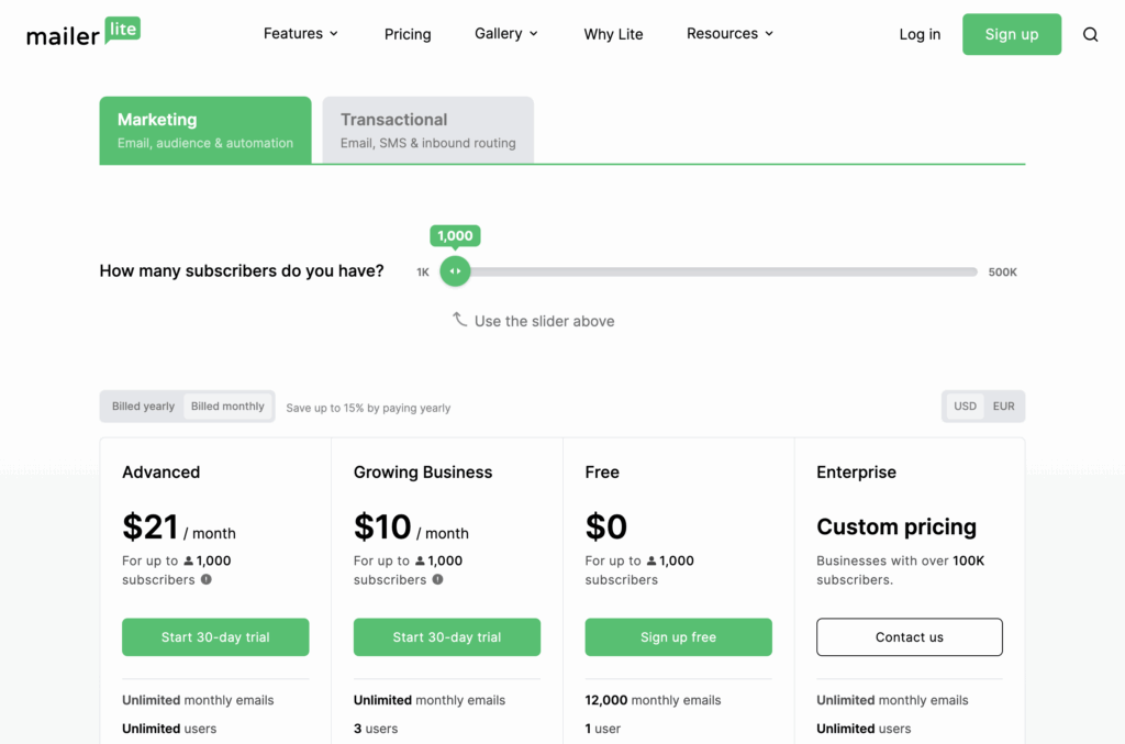 Previously, MailerLite’s free plan allowed up to 1,000 subscribers and 12,000 emails each month. Now, the free plan only lets you have 500 subscribers.