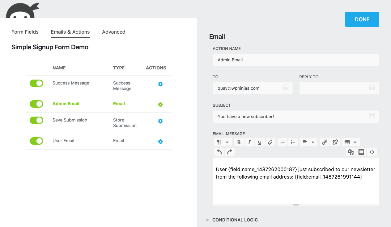 Want to shoot a confirmation email out to the user after signup? Want a notification after someone clicks subscribe? Offer incentive in the form of lead magnets/PDFS/etc? Deliver with Ninja Forms!