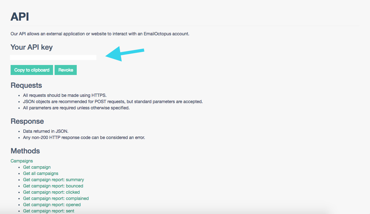 - Go on to your EmailOctopus account and copy your API key. This can be found on your dashboard, under the API section listed on the left.