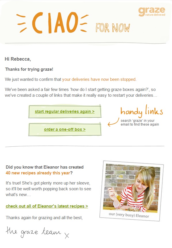 For example, the snack company Graze does an excellent job linking back to their latest blog posts with recent recipes. They spend no time weeping on a lost customer, but they immediately focus their efforts on getting them back with the quality work that converted them initially. Their light and happy message keeps the order cancellation email in a positive tone.