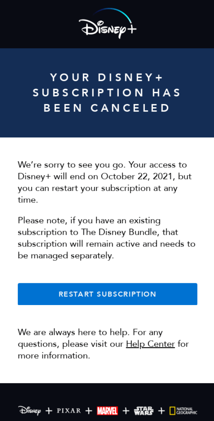 For example, Disney+ uses a short email with a simple “Restart your subscription” button, letting users know that their subscription has been cancelled and offering them the chance to resume it. They also let customers know up until when they have access to the service since they cancelled within the billing period. Minimal and on-point!