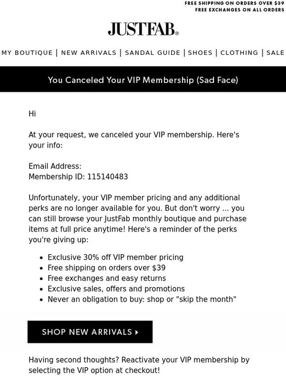 For instance, JustFab managed to squeeze in a short yet concise email listing all their customers’ privileges, such as free shipping, exclusive member discounts, and easy returns. Then, with a CTA inviting users to browse their latest shop arrivals, they lure them back into their products. They even include a short message for those reconsidering their VIP subscription cancellation, describing the steps to reactivate it. Ten out of ten if you ask us!