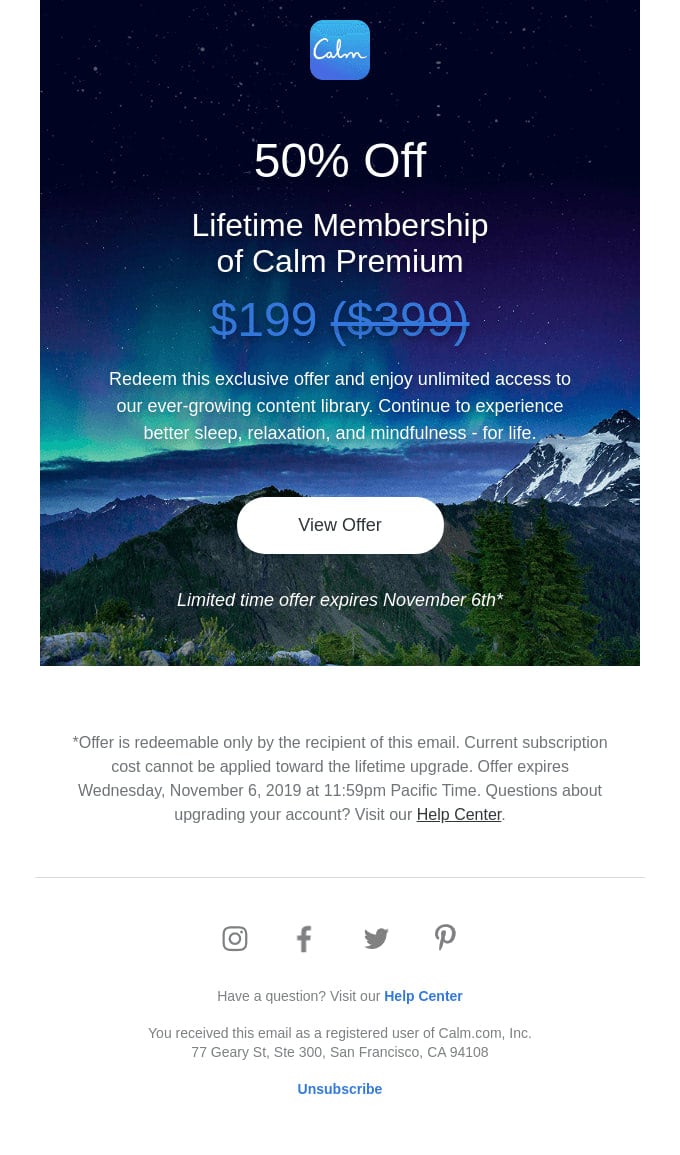 Take a look at this cancellation confirmation by Calm. They offer 50% off a lifetime membership valid for a specific time period. This way, customers can access the content library without restrictions while the brand gets to keep them on board. Win-win!