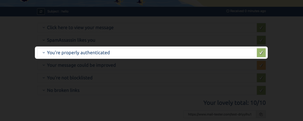 Then login to your EmailOctopus account and send a test email to the email address you had received from Mail-Tester, and then click the check score button.