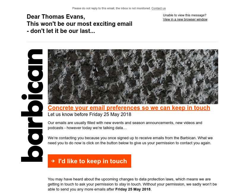 With just a week until the new GDPR legislation is introduced, inboxes are overflowing with re-consent emails. These emails ask the recipient to re-confirm their interest in receiving communications, and state that no further emails will be sent after May 25th if they decline (or ignore the email altogether)Over the past two weeks we’ve collected 50 examples of these re-permission emails, and picked out five top tips to help you with your last minute re-confirmation campaign: