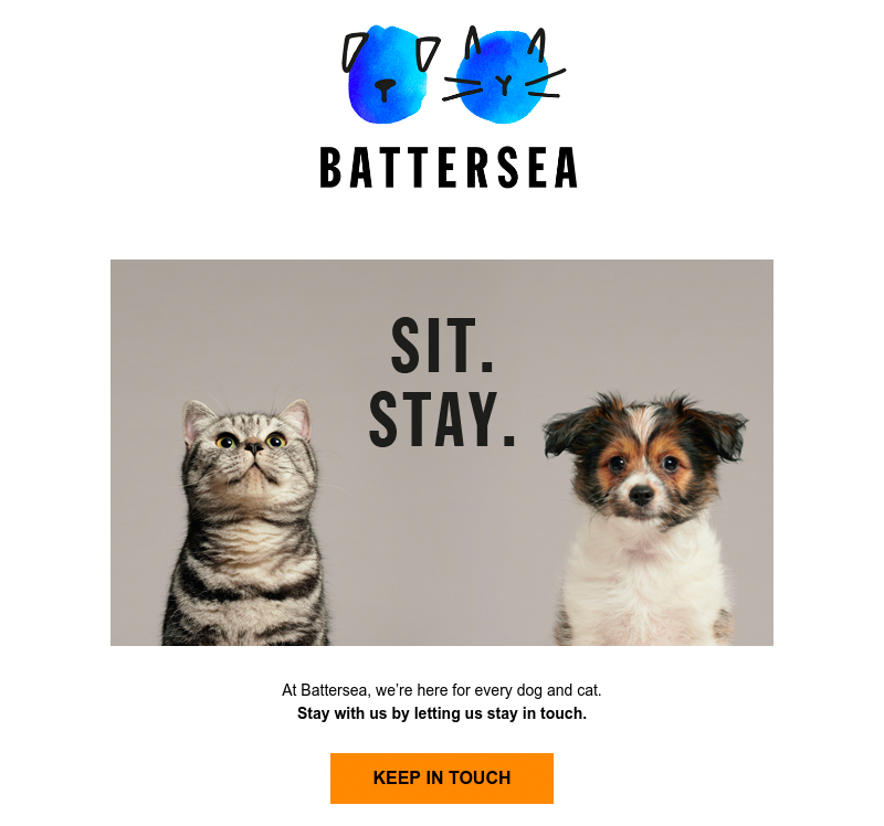 Battersea Dogs Home is an animal charity based in London. Their subject line of “Sit. Stay with us”  is a great example of how you can closely align a re-permission campaign with your brand and product, while making it fun at the same time.