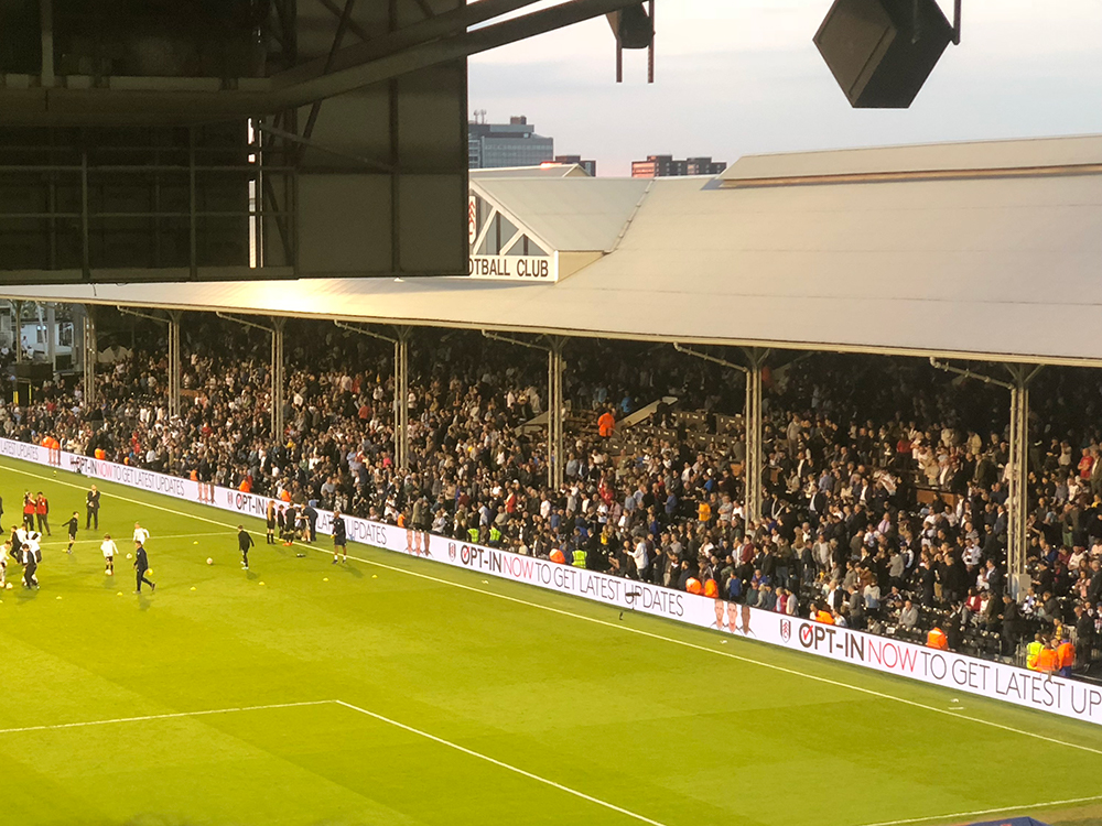 During their most recent football (soccer!) game against Derby, Fulham made use of their perimeter advertising boards to encourage fans to re-opt-in to their email list. This was the biggest game of the season – the play off semi-final – and boards would have cost upwards of £3,000 per minute to advertise on. The advert ran for most of the game which shows just how valuable a large mailing list is to Fulham.