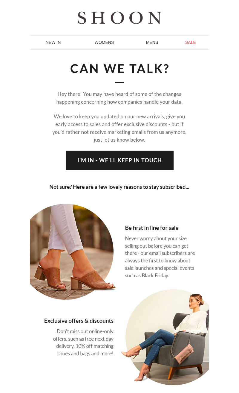 If you’re not keen on an incentive and a witty campaign doesn’t align with your brand, then you should at the very least explain why users should re-confirm. There are likely genuine reasons that customers will want to remain on a mailing list, so sell those reasons. Perhaps they get early access to sale products or get the latest updates before anyone else. Your campaign should explain those benefits, just like the following example from online footwear retailer Shoon.