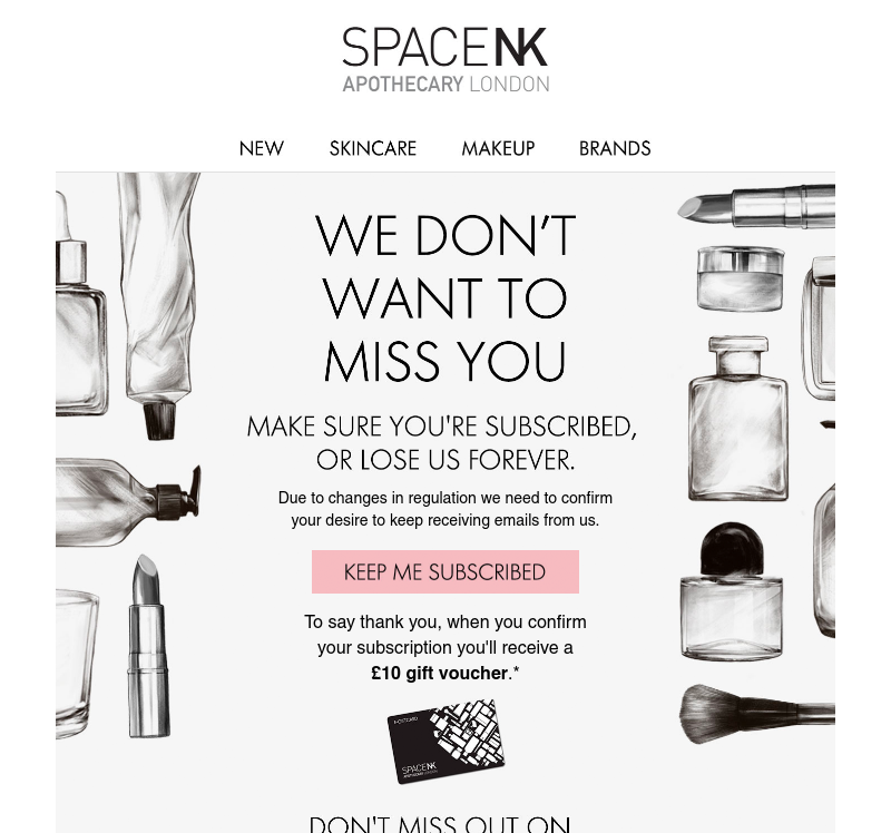 One example of an incentivised campaign is from Space NK, where presumably the lifetime value of having a customer on their mailing list exceeds the cost of the incentive offered. In the example below, the luxury beauty product retailer is offering a £10 gift voucher to all users who confirm their subscription.