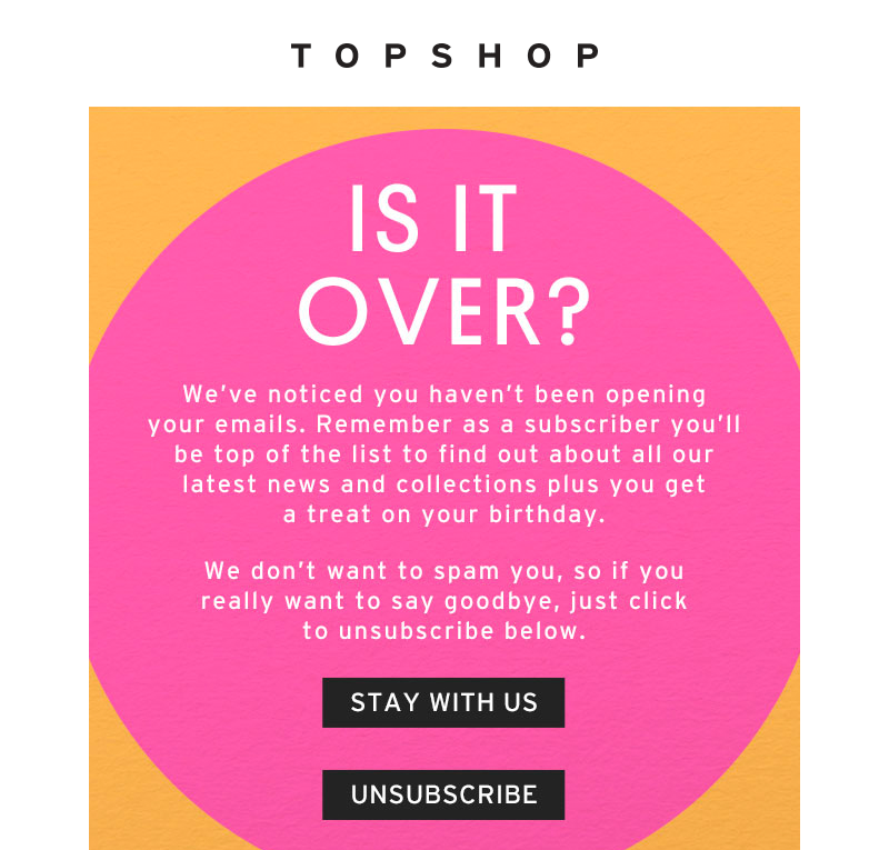 This goes without saying, but make sure you make it clear what you want your subscribers to do. Below your text, be sure to include at least one large button inviting them to re-confirm. Topshop, in the example below, increase prominence through size and contrast. Their large black ‘stay with us’ button is impossible to miss.