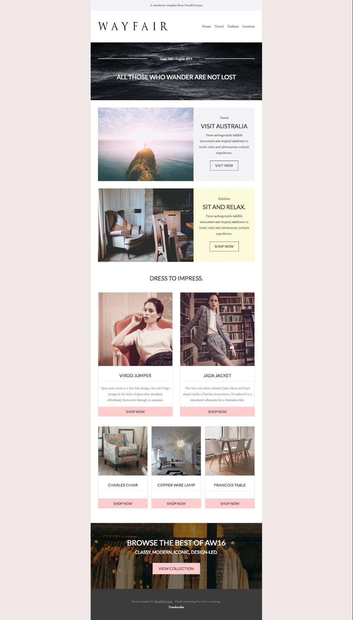 If you need a library of ready-to-use email templates check out EmailOctopus. It comes with an easy-to-use drag-and-drop editor for customising each template.