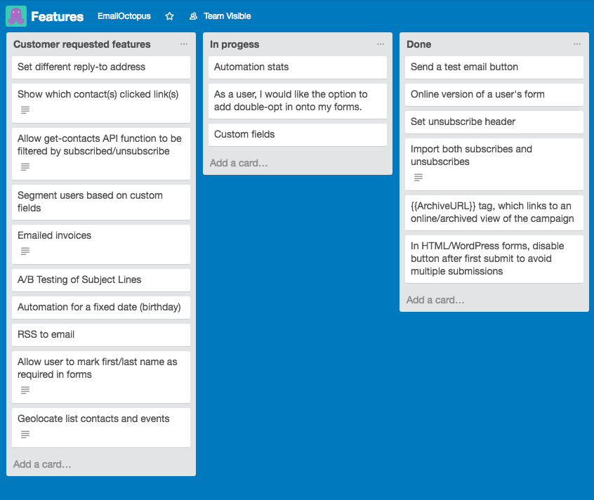 More often than not customers come to us with genuine and honest feedback on how we can improve the platform, usually that’s in the form of feature or integration requests. We record each of these requests in a specific Trello board and they’re regularly discussed during both our weekly planning and monthly meetings.