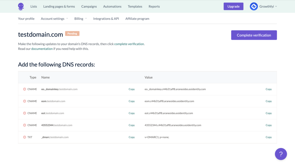 Just go to the settings section of your email marketing tool and look for senders/domains, and you’ll see an option for DNS verification. If it shows a warning like on the above image, then you need to take action to make sure your domain is properly authenticated.