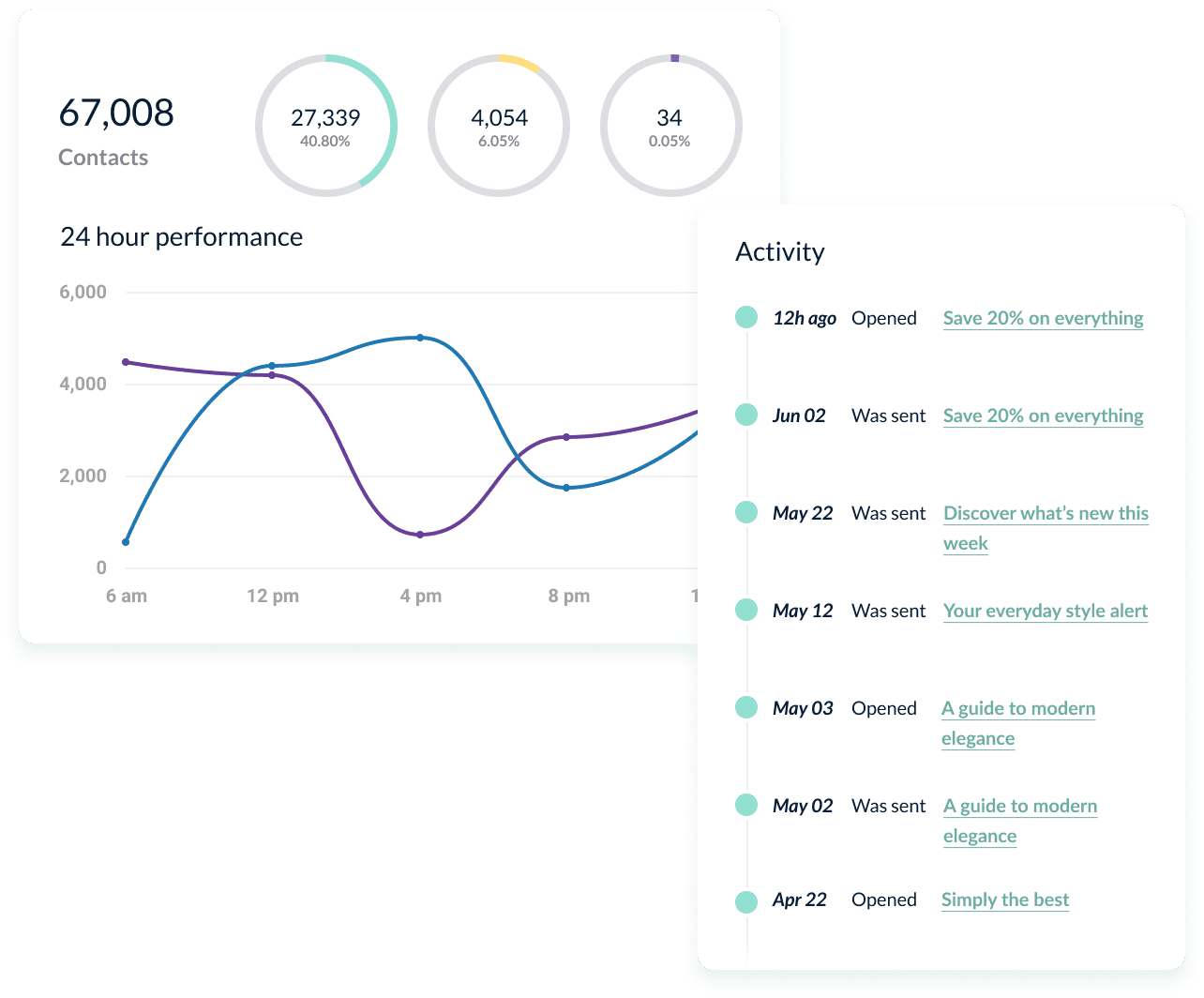 Find out moreKeep track of your open, click and bounce rates with straightforward email reporting. See what's working at a glance or dive into more detail with historical activity for your contacts.