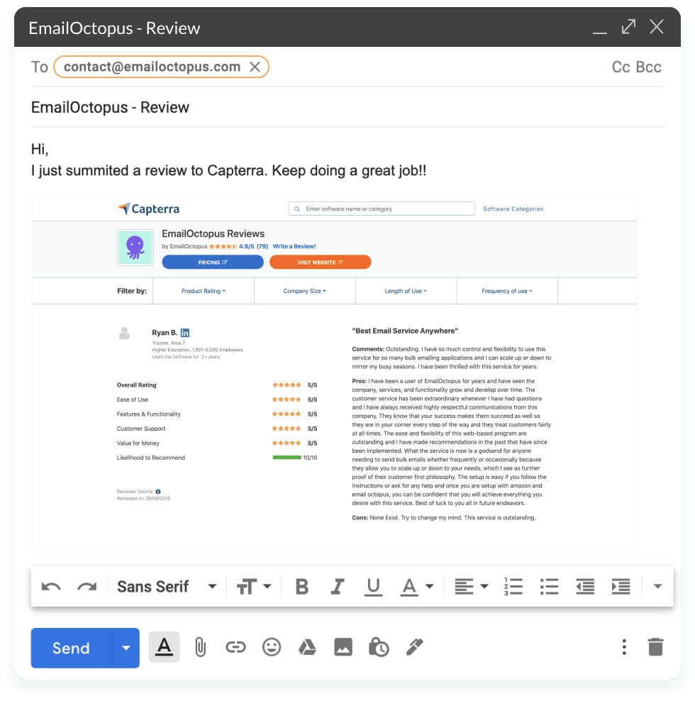 If you've enjoyed using EmailOctopus, post a review and earn up to $50 off your next invoice.